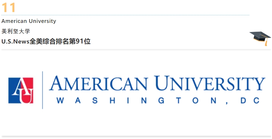 美利坚大学位于美国首都华盛顿特区,是1893年美国第23任总统本杰明哈里森提议国会建立美国文化教育代表大学而成立的,前后有6位总统在学校担任董事,学校是一个中高端精英私立大学,本科国际商务全美第8,公共预算全美14,学校在文科,商科,传媒,理科方向名列前茅,学校位于美国首都的使馆区中心位置,学校的正对面为国土安全局,是全美最安全的学校之一,首都DC众多金融机构,非营利性组织,STEM类公司等,学生在校实习率达到了89%,毕业生就职率达到99%。