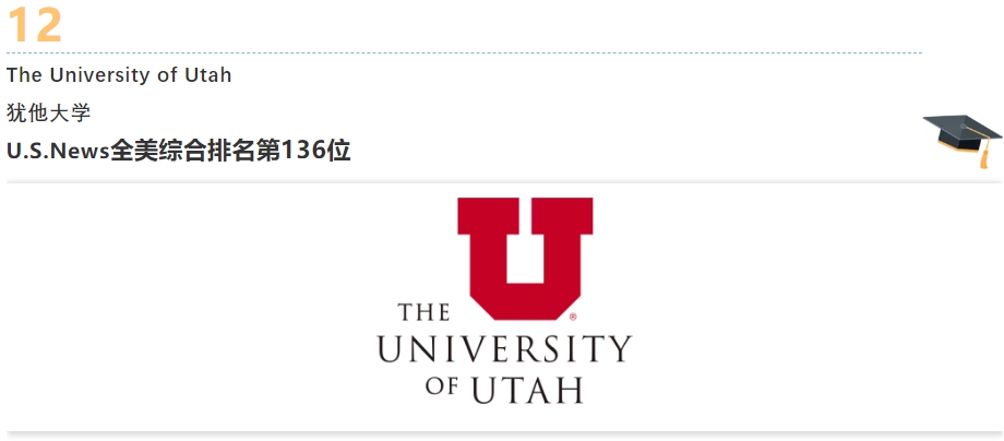 犹他大学位于全美最安全的城市之一犹他州首府盐湖城,是一所世界顶尖的公立研究型大学,拥有5位诺贝尔奖、8位麦克阿瑟奖、3位图灵奖、17位美国科学院与工程院院士、22位罗德学者、2位宇航员,是全美科研经费投资TOP50, 美国能源部投资的5所大学之一,游戏设计专业全美排名第1,创业学全美第7,计算机图形学的发源地。