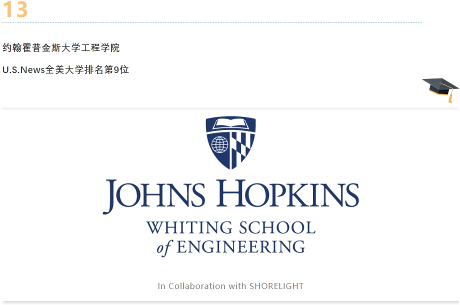 约翰霍普金斯大学工程学院(Whiting School of Engineering)是美国顶尖的工程研究学院之一,以跨学科创新和应用型科研著称,2024年U.S. News全美工程学院排名第16位。学院提供生物医学工程(全美第1)、机械工程、计算机科学等热门专业,并与JHU医学院、应用物理实验室(APL)深度合作,主导NASA、NIH等国家级项目。