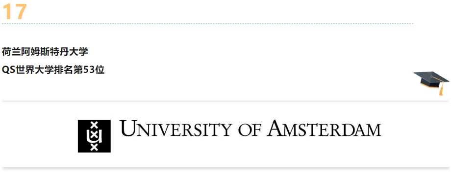 阿姆斯特丹大学成立于1632年,是欧洲历史最悠久的综合性研究型大学之一,全球学术声誉卓著,QS世界大学排名位列第53位。主校区拥有超过34,000名学生和6,000名教职员工,是荷兰规模最大的大学。UvA以高度的国际化著称,提供涵盖人文、社会科学、经济商科、法律、理学、医学及信息学等领域的200多个英语授课课程。其传播学、心理学、社会学等学科常年位居世界前列。荷兰本科均为3年毕业,国内高考同学可以通过预科的方式入读阿大,总共4年拿到本科学士学位,本科阶段每年学费约1万欧元。