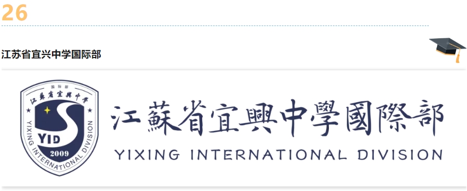 江苏省宜兴中学创建于1928年,国家级示范性高中。经宜兴市教育局批准,学校2009年创办国际部。2023年,江苏省宜兴中学与江苏天吴嘉登教育集团旗下的苏州湾外国语学校携手合作,共享优秀师资、教研和升学团队,目前70%以上教师有国内外名校背景,40%的教师曾赴海外留学深造。国际部在开设美国大学理事会AP课程基础上,引进了为全球超过160个国家逾万所大学认可的英国剑桥大学国际考评部IGCSE和 A Level 课程。江苏省宜兴中学不仅是AP学校(授权代码694284),而且是剑桥大学国际考评部认证考点(授权代码CX254)、阿思丹授权的国际理工科竞赛合作考点和朗思语言测评官方考点。