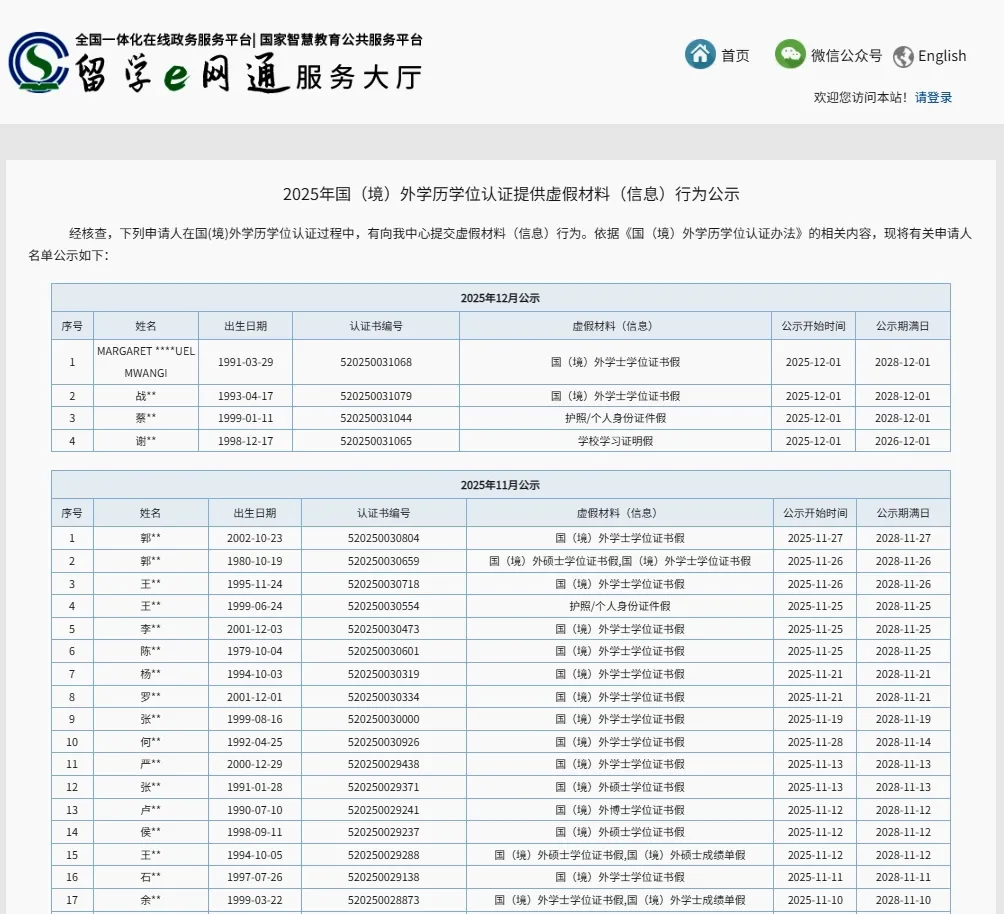 近日,教育部留学服务中心(简称“中留服”)更新了《2025年国(境)外学历学位认证提供虚假材料(信息)行为公示》。
